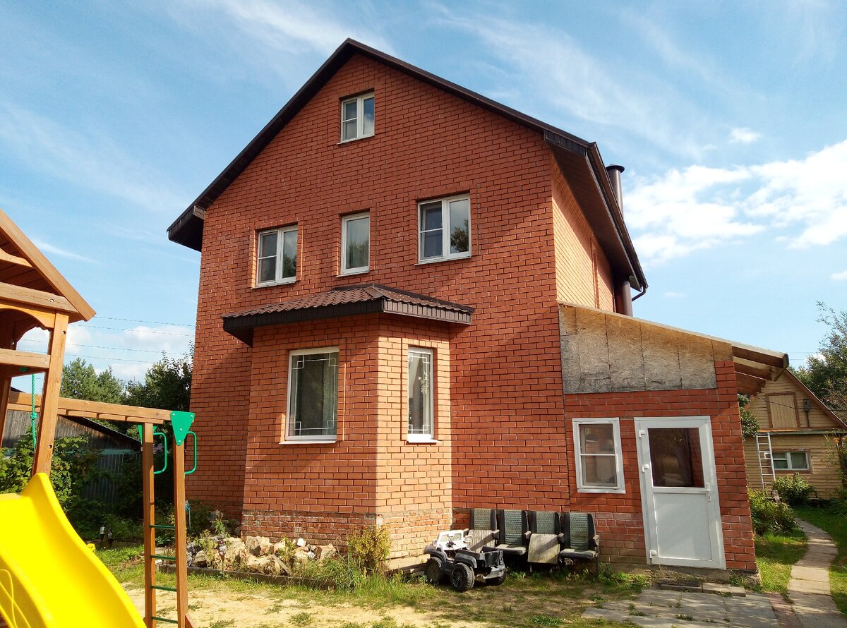 Для ребятишек перед домом соорудили детскую площадку. Здесь и домик, и горка, и лесенки, и качели, и скалодром.