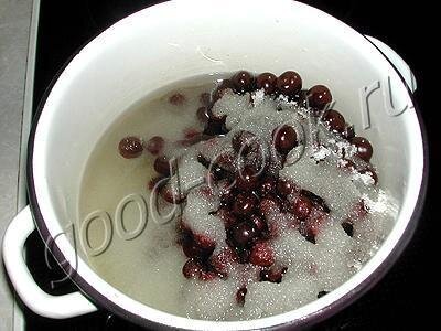 На дно эмалированной кастрюли налить воду, положить вишню и насыпать сахар.
