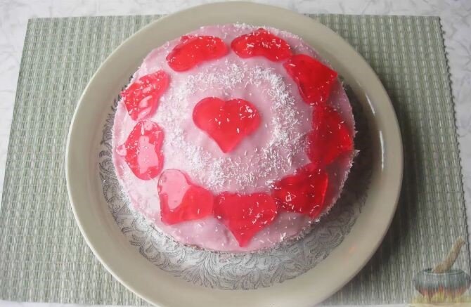 Нам понадобится : Для теста: Мука - 1 стакан Яйца - 3 шт. Молоко сгущенное - 380 г Сода - 1 ч.л.Сок лимонный (или уксус) - 1 ст.л. *Для крема: Сметана - 200 г Сахар - 1 стакан Сироп вишневый - 60 г Желатин - 1 ч.л. (15 г) *Для украшения: Желе вишневое - 2 пакетика Стружка кокосовая - 1 пакетик Готовим вишневое желе. Для этого содержимое 2-х пакетиков желе высыпаем в емкость и заливаем половинной нормой горячей воды, указанной на упаковке. Тщательно перемешиваем до полного растворения и выливаем в плоскую емкость c невысокими бортиками. Остужаем, а затем помещаем в холодильник для того, чтобы желе застыло и его можно было нарезать. Замачиваем желатин в горячей воде для набухания. Приступаем к приготовлению теста. Смешиваем яйца, сгущенное молоко, муку и соду, гашенную лимонным соком или уксусом. Готовое тесто разделяем пополам и выпекаем 2 коржа в горячей духовке при температуре 180 градусов примерно 30 минут. После остывания каждый корж разрезаем пополам, чтобы получилось 4