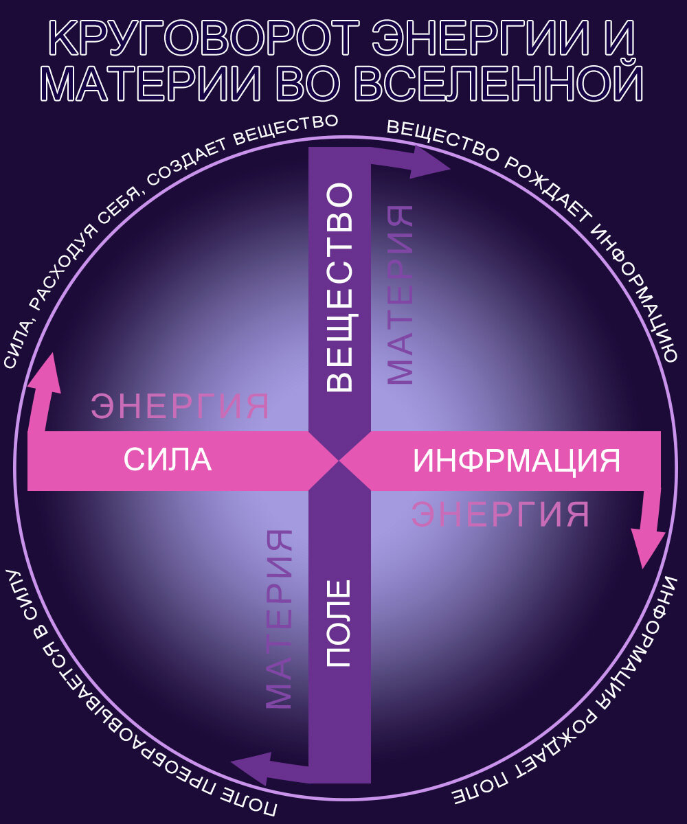 Если процесс возникновения жизни изложить физически, то мы должны принять во внимание следующую логику рассуждений. Первичными и главными, компонентами Вселенной, в которую входит в качестве отдельного космического образования и наша Галактика, являются энергия и материя. Хотя энергия и материя раздельно существовать не могут, это еще не доказано, но это раздельные субстанции. Субстанция - это энергия (или материя) в единстве всех форм их движения или проявления. Субстанции прочно связаны друг с другом, и проявление одной из них – энергии или материи – невозможно без присутствия другой. Каждая субстанция может иметь две формы своего существования: у энергии формами существования являются сила и информация; у материи – вещество и поле. Поскольку субстанции неразрывно связаны между собой, то при их постоянном взаимодействии они всегда стремятся к преобразованию самих себя путем различных комбинаций всех форм, которые они имеют, но все преобразования только взаимные. Например, для того, ч