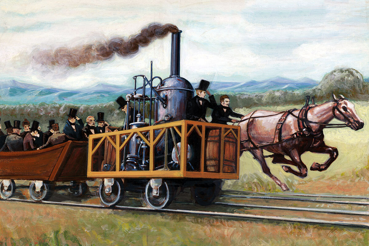 Посмотрите на картину вверху. Там изображено состязание лошади с паровозом в США. Бывало так, что в первых состязниях лошади даже побеждали...