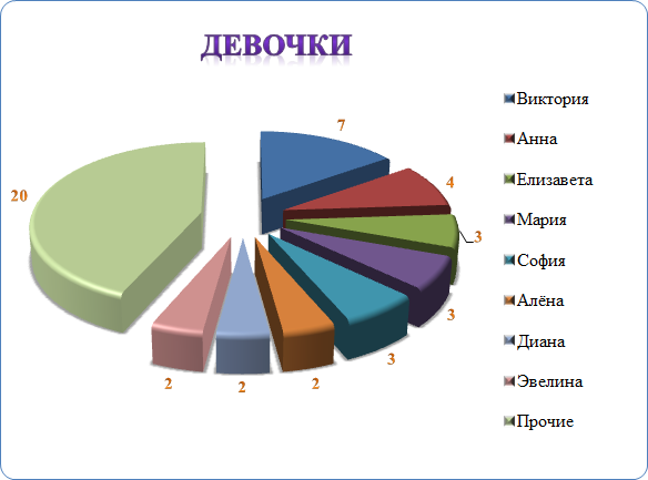 Больше половины девочек (57%) имеют всего восемь имён - Виктория, Анна, Елизавета, Мария, София, Алёна, Диана, Эвелина. Наглядно показываю на диаграмме, цифра обозначает количество девочек с таким именем.