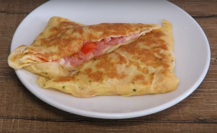 В отдельную ёмкость разбейте яйца и слегка взбейте вилкой, чтобы белки и желтки смешались. Для удобства дальнейшего приготовления можно взбивать и обжаривать по одному яйцу за раз, но тогда блинчики получатся чуть более толстыми. Разогрейте сковороду на среднем огне и смажьте растительным маслом. Влейте порцию взбитых яиц и распределите по сковороде, чтобы получился тонкий яичный блинчик. Жарьте блинчик примерно 1-2 минуты, пока яичная масса не "схватится". Затем переверните яичный блинчик на другую сторону. В центр блинчика выложите немного ветчины и натёртого сыра. У меня получается 5 тонких или 4 толстых блинчика, поэтому начинку я делю соответственно на 4-5 частей и распределяю между блинчиками. Сверните яичный блинчик с начинкой конвертиком. Для этого сперва подверните свободные края блинчика слева и справа от начинки и сложите по направлению к це