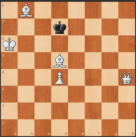 Шахматная задача. Автор А. Липпман, 1981 год. У черного короля два поля на которые он может пойти: c8 и е8. Белые начинают, и используя силу двух слонов и ферзя ставят мат в 2 хода.
