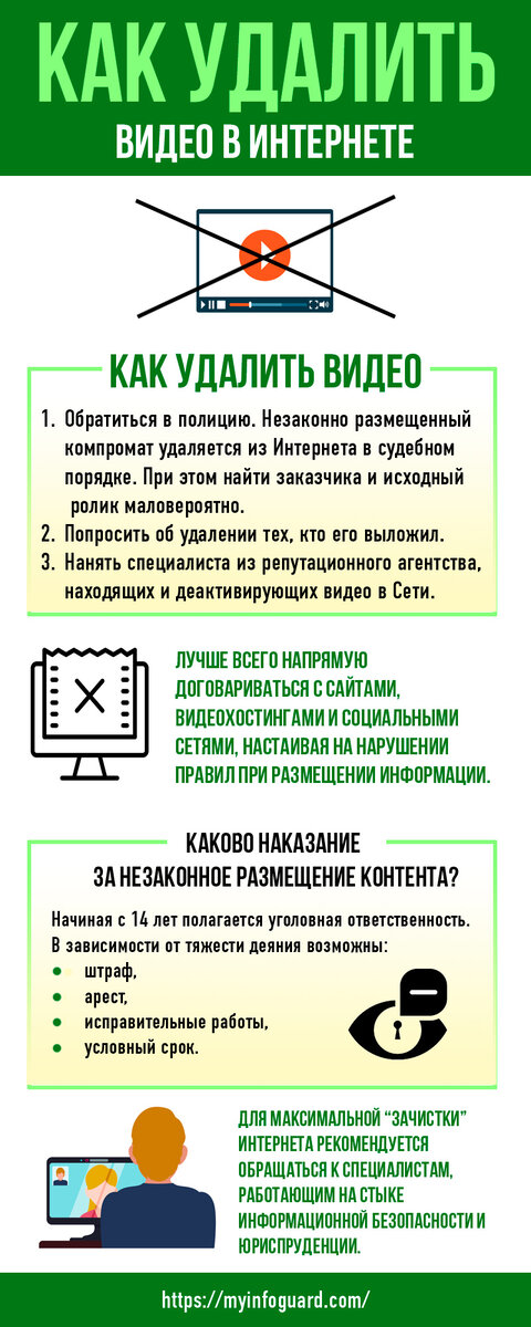 Что делать, если в Интернет выкладывают компрометирующие видеосюжеты? Удалить их достаточно сложно, а судебные процессы безрезультатны или тянутся долгое время. Лучше всего обратиться к специалистам, работающим на стыке информационной безопасности и юриспруденции. Став жертвой шантажа нельзя платить мошенникам за «удаление фото и видео из Интернета». Покорность жертвы приводит к тому, что они продолжают размещать видео на новых ресурсах и вновь требуют денег. Обычно ролики выкладываются на нескольких веб-площадках, откуда расползаются по блогам или сайтам. Когда удаление видео обязательно? Это надо делать в случаях: Как удалить видео из интернета навсегда? Лучше всего напрямую договариваться с сайтами, видеохостингами и социальными сетями, настаивая на нарушении правил при размещении информации. Если нежелательный видеосюжет безупречно сделан, не нарушает правил сайтов и буквы закона, удалить его гораздо сложнее. Опротестование видео также способно привлечь к нему чрезмерное внимание
