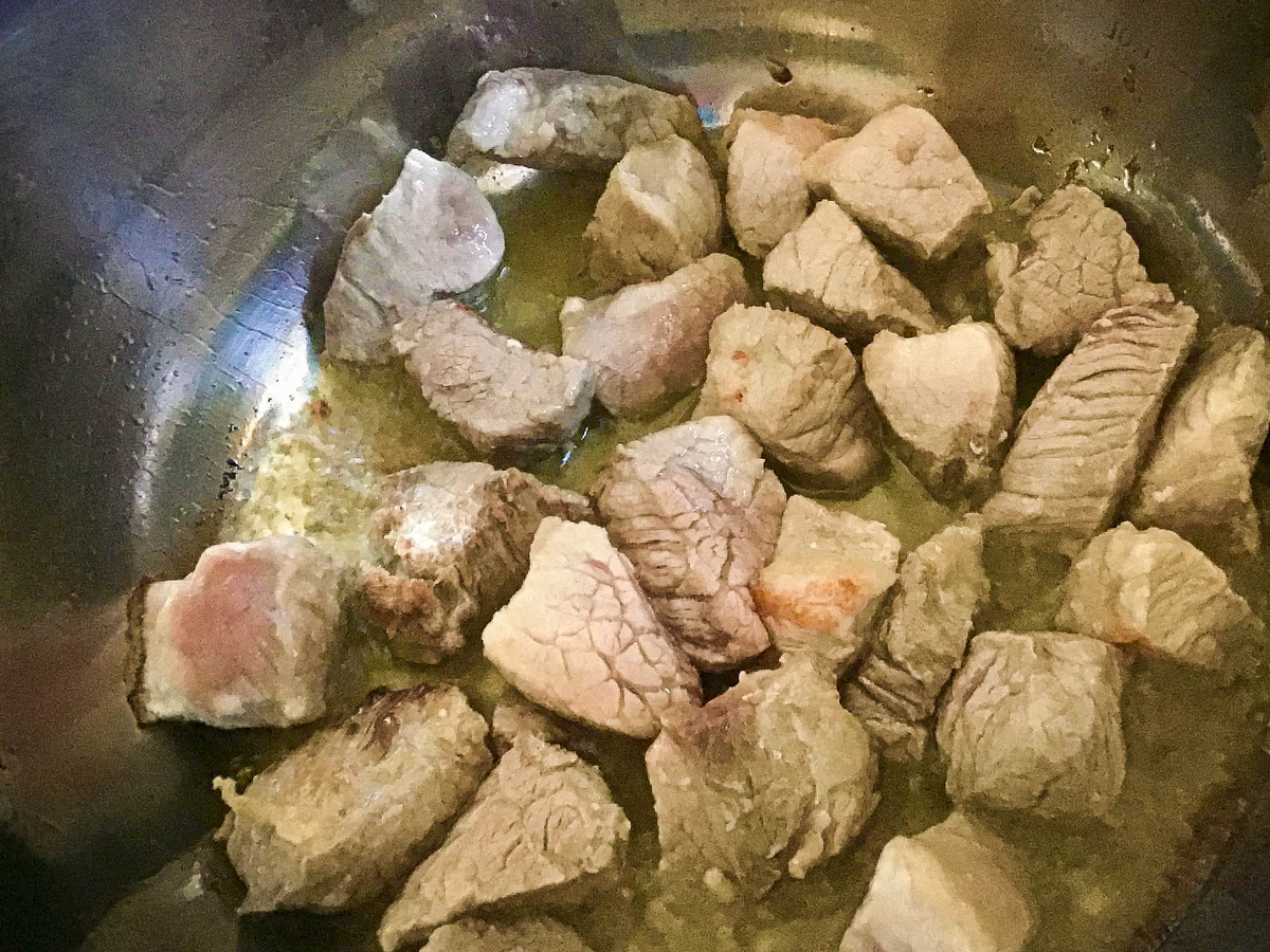 А не так давно я чуть-чуть по другому подошел к этому вопросу и итог был на удивление прекрасным. Ныне готовлю супы лишь только так и сейчас попытаюсь для вас это продемонстрировать. Ну собственно что ж, давайте стряпать Нам понадобится кастрюля с плотным дном и немного обычного растительного масла и все это надо разогреть. Берем мяса примерно 350гр., нарезаем маленькими кусками и засыпаем в нагретую кастрюлю с маслом. Жарим пару тройку минут и засыпаем туда заранее порезанный лук Тщательно перемешиваем и добавляем натертую мокровь Далее специи на свой вкус, но я стараюсь добавлять лаврушку и молотый перец. Как засыпали, мешаем, и жари опять около пары тройк
