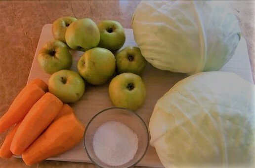 Берем ведро или кастрюлю. На дно Выкладываем небольшой слой капусты. Потом яблочки. И заполняем оставшейся капустой.