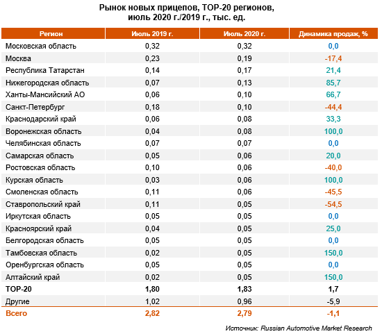 По данным Russian Automotive Market Research, в июле 2020 г. продажи новых прицепов сократились на 1,1% по отношению к июлю 2019 г. и составили 2,79 тыс. ед. Рейтинг регионов в июле 2020 г. возглавила Московская область, где продажи прицепной техники сохранились на уровне июля 2019 г. В ТОР-3 региональных рынков также вошли Москва и Республика Татарстан. В столице спрос на новые прицепы упал на 17,4%, а в Татарстане вырос на 21,4% ... [1] Далее по тексту - прицепы https://www.napinfo.ru/press-releases/bolshe-vsego-pritsepov-v-iyule-prodano-v-moskovskoy-oblasti