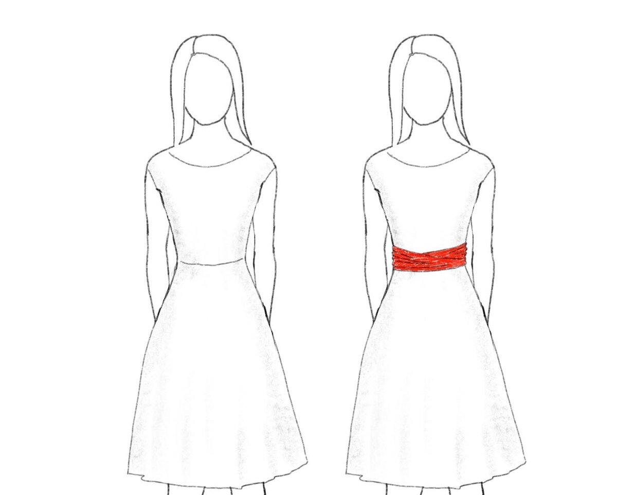 Обозначается талия с помощью тонкого и не очень яркого/контрастного ремешка, пояса, конструктивного шва или просто края изделия.