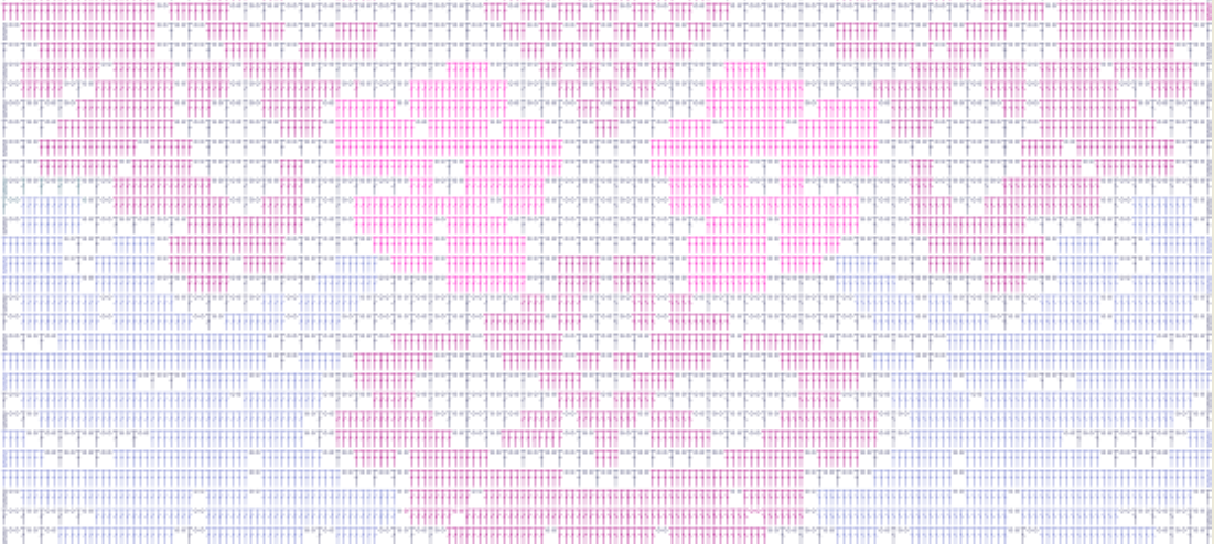 - 1 пустая ячейка, 3 ССН, 1 пустая ячейка, 3 ССН, 8 пустых ячеек, 12 ССН, 2 пустых ячейки, 6 ССН, 4 пустых ячейки, 18 ССН, 2 пустых ячейки + 5 в.п. (3 в.п. подъема + 2 в.п. для узора) и поворачиваем вязание.