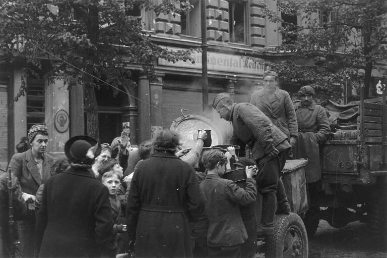 Довольно скоро на улицах Берлина стала привычной картина очереди немцев (преимущественно, немок и их детей) к советской солдатской полевой кухне. Получая еду, многие берлинцы благодарили по-русски, говоря: «Спасибо!». В этих же очередях многие выучили слова «Borschtsch» — «борщ», «Kascha» — «каша». Кстати говоря, слово «Kascha» со временем закрепилось в немецком языке для обозначения только лишь гречневой каши. Все другие — немцы называют исконным немецким словом «Brei».
