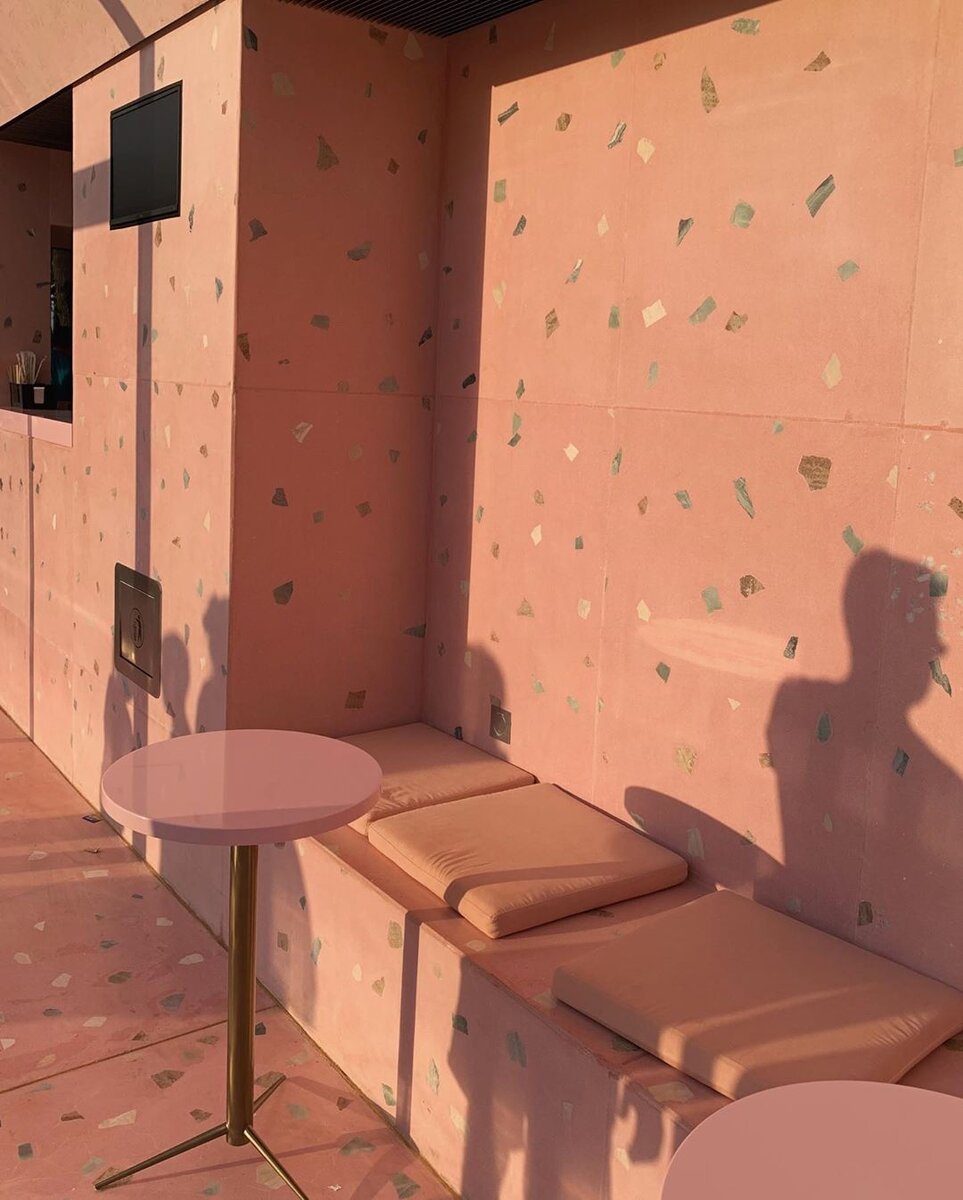 Внутри всё розовое: стены из венецианского терраццо, небольшие круглые столики и подушки. Посадочные места расположены по всему периметру куба, никаких перегородок и лишних деталей. Ассортимент мороженого большой: если вы весы — вам будет сложно выбрать. Есть безлактозные варианты: на миндальном или кокосовом молоке и ягодно-фруктовые сорбеты.