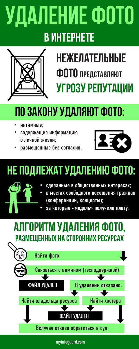 Удаление фотографий из Интернета – трудоемкая, но вполне посильная задача. Необходимость удаления снимков диктуется разными причинами, чаще всего – угрозой репутации. В теории все звучит красиво: найти сайты, разместившие нежелательный фотоконтент, связаться с админами с просьбой об удалении, напомнить о праве на забвение и дальше жить спокойно. На деле же не все можно найти, админы дают от ворот поворот, обращение в суд и в полицию оборачивается долгими и неэффективными разбирательствами. Какие фото подлежат безусловному удалению? Администрация сайтов и соцсетей оперативно удаляет снимки: Не подлежат удалению снимки, сделанные без согласия людей: Какие трудности могут возникнуть при удалении фото? Как можно воздействовать на админа сайта, чтобы он удалил фото? Какие есть варианты удаления фото? Если не удается договориться админами сайта по-хорошему, остается обращаться в суд либо в репутационное агентство. Первое – малоэффективно, второе – дорого. Но спокойная жизнь стоит дороже! Бер