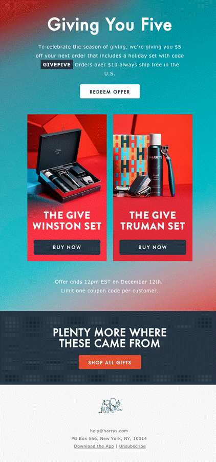 В начале 2013 года это был один из самых популярных стилей в веб-дизайне, но он отошёл на задний план из-за нового тренда — материального дизайна. Сейчас, благодаря таким брендам как Harry'S и American Eagle Outfitters, градиентные фоны с двумя контрастными цветами вновь возвращаются в email-письма.