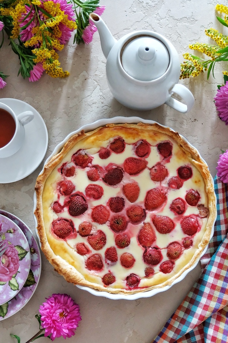 Очень нежный пирог с ароматной клубникой можно приготовить в любое время года, т.к. ягоды можно брать замороженные. Да и сами ягоды можно менять на чернику, смородину, малину и др. или делать микс. Итак, нам понадобится: - слоеное тесто - 2 пластины, - рикотта - 500 г, - 3 яйца, - клубника 300-500 г, - сгущенное молоко - 380 г (1 банка), - мука для раскатывания теста, - 1 ст.л. сливочного масла для смазывания формы. Готовим: 1. Слоеное тесто разморозить, стол присыпать мукой и раскатать тесто по размеру формы. 2. Яйца взбить до бела, добавить сгущенное молоко. 3. Рикотту выложить к яичной массе и хорошо взбить. 4. Смазать форму для выпечки маслом и присыпать мукой. Выложить тесто. У меня на 28 см ушло как раз 2 пласта. Края теста обрезать, остатками можно украсить пирог. 5. Вылить на тесто получившуюся смесь. Добавить целые ягоды клубники. 6. Выпекать в разогретой до 180 гр. С духовке 30-40 минут. 7. Дать остыть пирогу и, если сможете оставить хоть кусочек, убрать на ночь в холодиль
