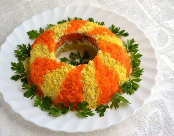 Подготовка к очередному празднику у меня произошла с новинками на праздничном столе. Пролистывая очередной кулинарный журнал, я наткнулась на интересный и очень простой рецепт салата. Для салата "Любаша" потребуется: Куриное филе - 400 г Шампиньоны - 200 г Яйца - 4 шт Картофель вареный - 2-3 шт Морковь - 2 шт Майонез Растительное масло - 2-3 ст. л. Луковица - 1 шт Зелёный лук Укроп Приготовление: Мелко нашинкованные грибы с луком обжарить на растительном масле до готовности. Куриное филе, морковь и картофель отварить и отсудить. Морковь и картофель очистить. На плоское блюдо поставить перевернутый стакан. 1 слой: вокруг стакана выложить слой тертого картофеля, немного посолить. Смазать майонезом. 2 слой: выложить слой мелко нарезанного куриного филе. Смазать майонезом. 3 слой: слой мелко нашинкованного зеленого лука. 4 слой: слой половины тертой моркови. Немного посолить и смазать майонезом. 5 слой: выложить слой грибов с луком. 6 слой: выложить слой тертых яичных белков. Смазать майон