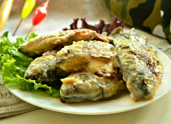 отлияное блюдо из речной рыбы . которое понравиться всей семье ! ингридиенты: способ приготовления: 1шаг.Очистите карасей от чешуи ,вычистите изнутри ,промойте в воде.Натрите рыбу солью и перцем.Положите в катрюлю ,засыпьте луком ,нарезаным тонкими кольцами,оставьте на 2 часа в холодильнике . 2шаг.Через 2 часа рыбу без лука обваляйте в муке с двух сторон .На сковороде разогрейте масло , пожарьте карасей до корочки .Затем переложите в жаропрочную посуду для запекания . 3шаг.Бульонный кубик растворите в стакане горячей воды .Залейте им рыбу ,затем смешайте сметану с 1 ст.л. муки и накройте ею карасей .Тушите 35 минут.В духовке разогретой до 200 градусов . 4шаг.Подавайте к столу с укропом ,дольками лимона или лайма и макаронами.Например,можно отварить макароны-гнезда .Приятного аппетита ! Рецепт вкуснейшего окуня в кунжуте здесь