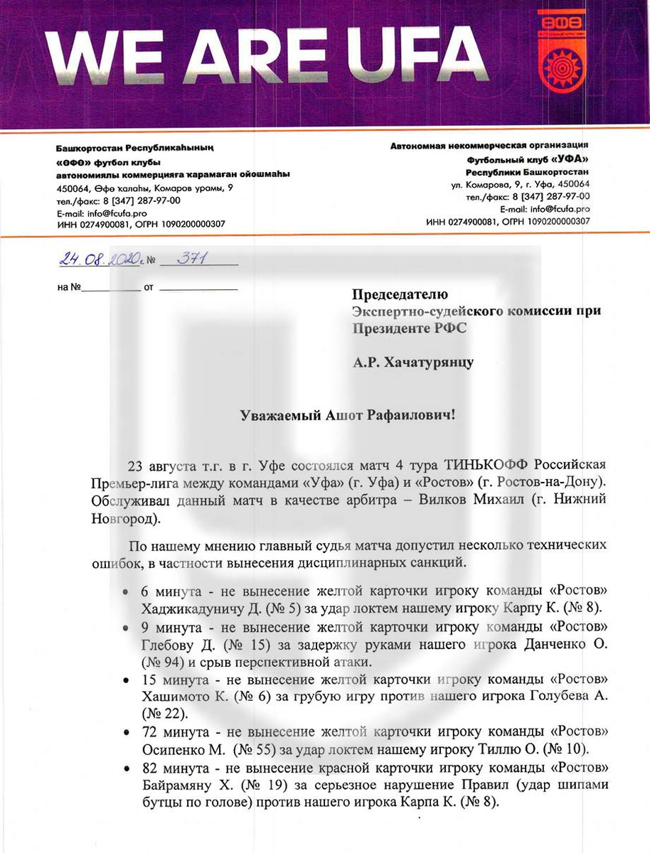 "Уфа" отправила официальное письмо главе судейского комитета РФС