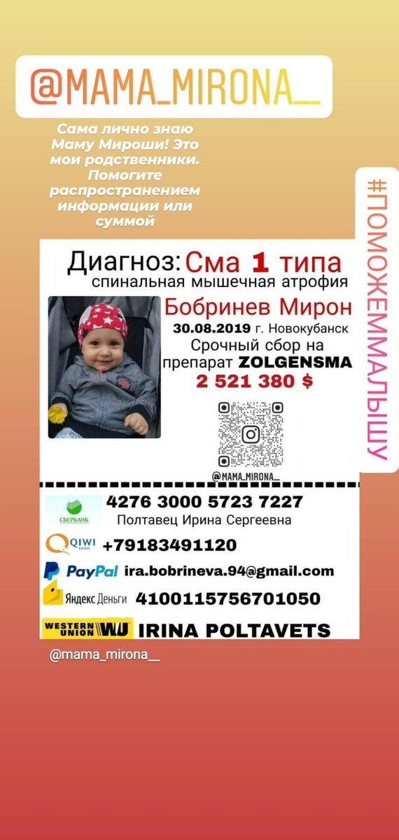 Прошу помощь в распространении информации, либо какой-нибудь суммой. Эта беда произошла с моими родственниками Мироше в этом месяце исполниться всего лишь годик. Но к сожалению, у него диагноз 1СМА.. Из-за данного диагноза ему осталось 6 месяцев. НО ЕСТЬ СПАСЕНИЕ. И к сожалению, оно очень дорогое. Это лекарство Zolgensma. Помогите спасти малыша #zolgesma #1СМА