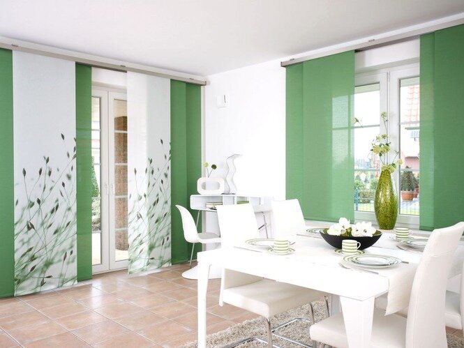 Раздвижные экраны не занимают много места, но все же не стоит их устанавливать в небольших комнатах с маленькими окнами. В таких условиях они не будут производить должного эффекта, а лишь визуально уменьшат пространство. Чтобы шторы-панели в интерьере современной квартиры смотрелись наиболее эстетично, помещение должно быть просторным, с большими окнами и обилием света.