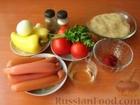 Туда же добавляем сосиски и рис. Перемешиваем и заливаем горячей водой. Вода должна быть выше содержимого сковороды или сотейника примерно на 1,5-2 см. Убавляем огонь, накрываем крышкой и тушим до готовности риса.