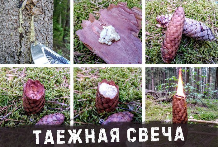 Важное достоинство - свеча-шишка не гаснет на ветру и во время лёгкого дождя. Время горения около 15 минут. Шаг 1. Набрать смолы-живицы. Шаг 2. Выбрать свежую шишку. Шаг 3. В чашку надо положить вашу живицу. Шаг 4. Поджигаем и радуемся. Света от неё не много, однако когда уже совсем темно - неплохой вариант. Тем более, что на изготовление одной свечки идёт всего пару минут. Их можно наделать впрок засветла. Безусловно, такая мелочь не заменит факела или фонаря. Однако при походе по нужде, для обкуривания от комара и даже для отпугивания всяких мелких хищников - самое то! Таёжная