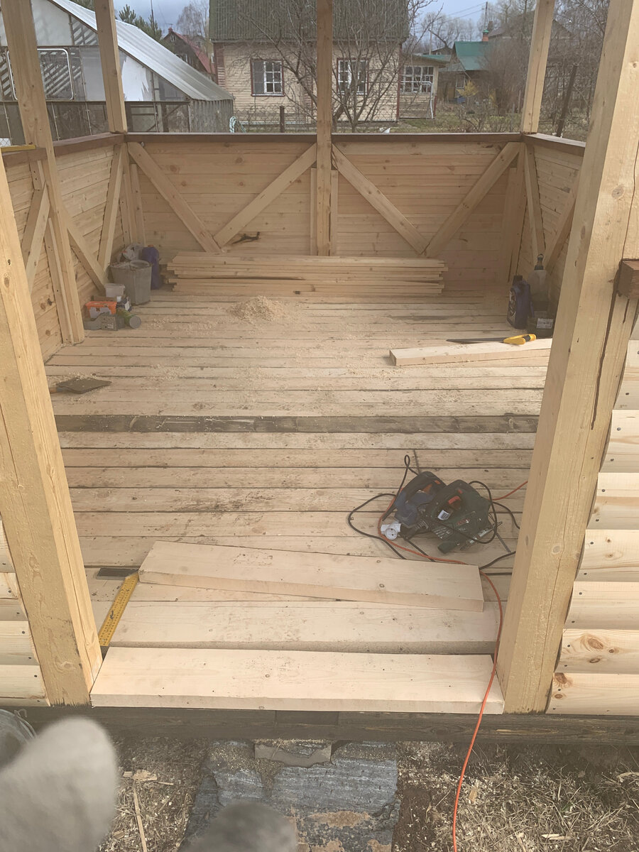 Ну вот уже почти заключительная серия создания беседка своими руками. У меня останется еще одна статья и я покажу как ее доделал до конца, а сейчас покажу как стелил полы и красила супруга.