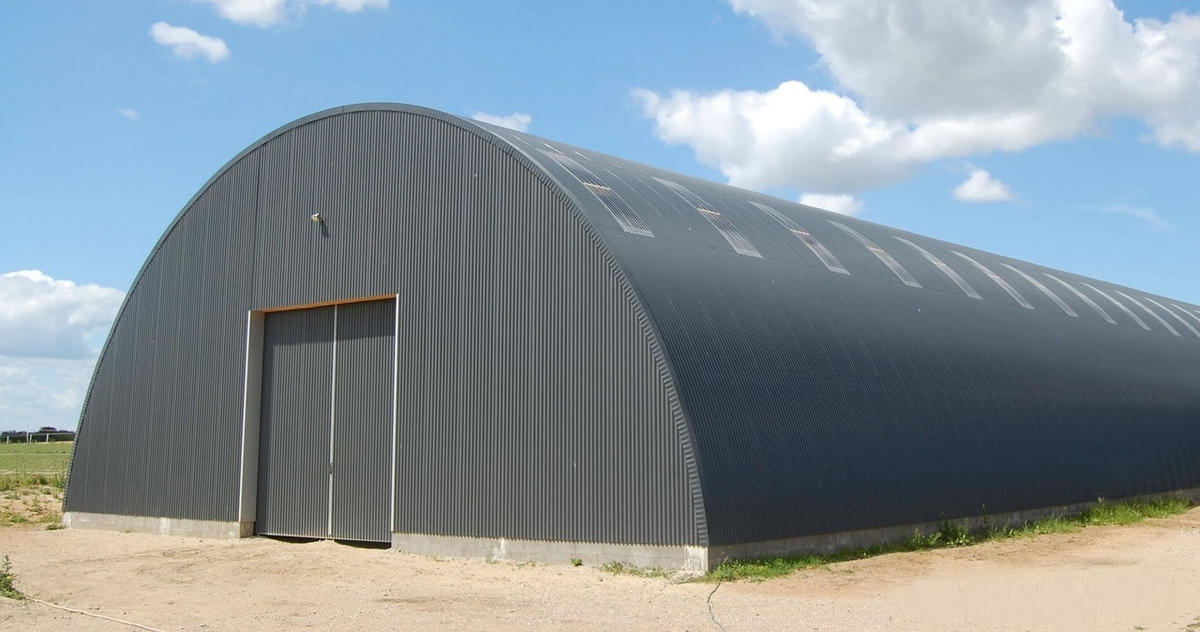 Основным материалом для строительства служат стальные оцинкованные листы. Из них изготавливают холодногнутые профили арочной формы непосредственно на строительной площадке. Полученные дуги соединяются забортовочной машиной по 5 штук, а полученные «пятерки» затем устанавливают на готовую основу (фундамент). Здание получается полностью готовым к эксплуатации.
