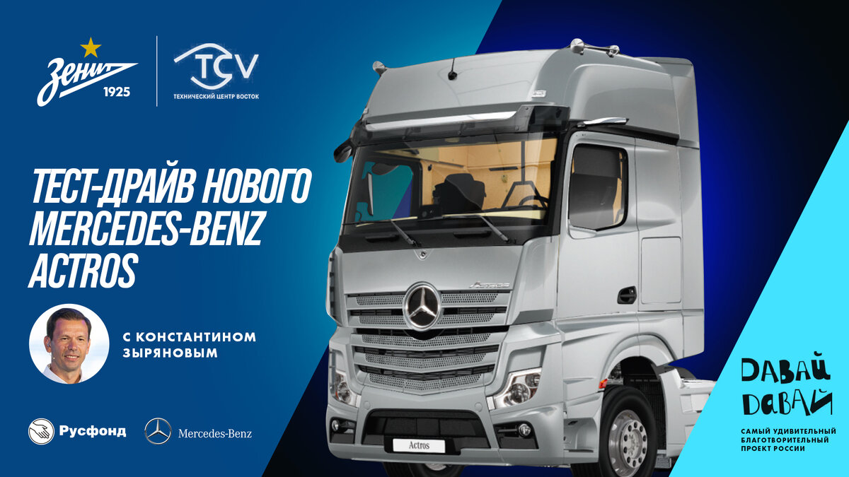 #ТестДрайвActros #Зырянов #фкЗенит #Мерседес #ТестДрайвГрузовика #НовыйActros #Actros2021 #Грузовики Константин Зырянов принимает вызов благотворительного проекта «Давай-Давай!» и станет инструктором тест-драйва инновационного Mercedes-Benz Actros. В рамках благотворительной акции «Давай-давай!», направленной на помощь подопечному «Русфонда», легендарный футболист сине-бело-голубых и старший тренер молодежного состава проведет тест-драйв инновационного Mercedes-Benz Actros в Санкт-Петербурге на территории Технического Центра «Восток». Благотворительный проект «Давай-давай!» – это совместная акция футбольного клуба «Зенит» и «Русфонда», к которому присоединились Технический Центр «Восток» и «Даймлер Камаз Рус», предоставив уникальную возможность Константину Зырянову стать инструктором по тест-драйву и собрать необходимые средства в размере 2 128 000 рублей на лечение для четырнадцатилетнего Олега Козаева. Все, что нужно от вас — сделать пожертвование, остальное — за нами. Давай-давай! П