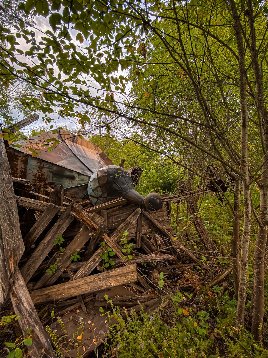 Влияет ли табличка "Памятник истории и культуры регионального значения. Охраняется государством" на сохранность той или иной достопримечательности? Глядя на фото, ответ очевиден. Старинная часовня склонила свою голову на ветви деревьев, не выдержав капризов погоды и наплевательского отношения. Тем временем мимо проезжают машины, проходят люди, шумит ветер в кронах деревьев, а она лежит среди кустов и догнивает. Часовня Николая Чудотворца впервые упоминается в XIX веке. Была приписана к церкви в Пенино, в которой активно идёт к завершению реставрация. Интересно, что на табличке написано название другой часовни, что находится в соседней деревне. Местные же жители утверждают, что это Никольская часовня. Пока мы исследовали руины, к нам вышла женщина из соседнего дома, очень переживает, что их деревня лишилась деревянной часовенки. Просила привлечь внимание к этому месту, но ведь все мы прекрасно понимаем, что восстановление уже невозможно, за неё нужно было браться много лет назад.