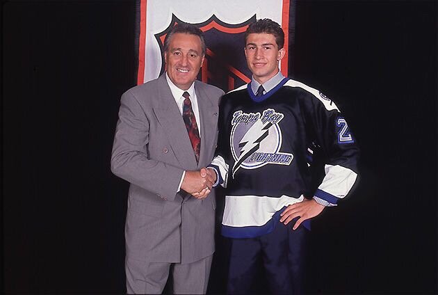 Всем любителям хоккея и ретро фотографий пламенный привет! В новом выпуске мы вспомним дебютный сезон в лиге команды Тампа-Бэй Лайтнинг. Они, вместе с Оттавой Сенаторз сыграли первые игры в сезоне 1992/93. Сегодня мы вспомним, кто начинал писать историю этой славной команды! Сама идея появления команды в Тампе зародилась в голове легендарного Фила Эспозито. Его смело можно называть отцом этой франшизы. Но сначала давайте обсудим эту фотографию. На ней Эспозито жмет руку первому игроку Тампы выбранного на Драфте- Роману Гамрлику. Чешский защитник был выбран под первым номером Драфта-92. За Лайтнинг Роман играл с 1992 по 1998 годы. Гамрлик является пятым европейцем в лиге по сыгранным матчам (1395), уступая только соотечественнику Ягру, шведу Никласу Лидстрему, финну Теему Селянне и словаку Здено Харе. Первое вбрасывание в истории Тампы-Бэй Лайтнинг. Фил Эспозито стал ген. менеджером, его брат Тони стал главным скаутом франшизы. Помимо Фила и Тони, инициаторами создания команды ст