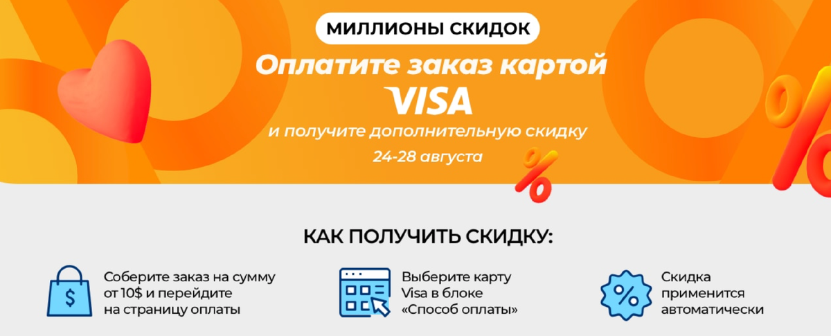 В этот раз можно сэкономить не только за счет скидок от продавцов и купонов, но и с помощью банковской карты. Чтобы получить дополнительную скидку, просто оплатите покупку дороже $10 картой VISA.