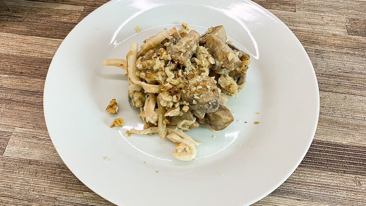 Кальмаров очистить и варить 2 минуты в кипятке, остудить и нарезать соломкой. Орехи нарезать мелко. Грибы с луком порезать и обжарить на растительном масле на сильном огне до золотистости. Сыр натереть на терке.