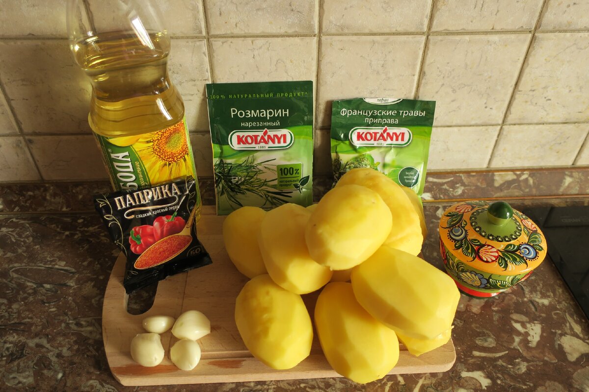 Пока картофель запекается, чеснок чистим и режем на дольки, в маленькую емкость складываем наш чеснок, добавляем розмарин, сухие пряные травы по вкусу и желанию, заливаем растительным маслом, чтобы масло покрыло чеснок и травы. Так масло пропитается ароматами чеснока и трав.