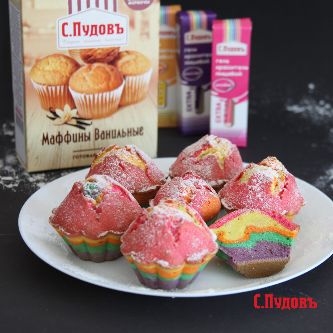 Поднимаем настроение всего одной коробкой смеси и несколькими красителями! Замешиваем, раскладываем, красим, выпекаем – вуа-ля! Яркие, не похожие ни на что, разноцветные радужные маффины уже зовут вас на импровизированную вечеринку :)
