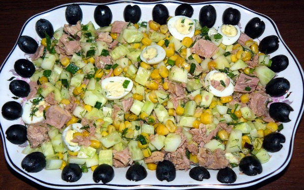Легко удивить гостей вкусным и красиво украшенным салатом! Ингредиенты: консервированный тунец в масле - 1 баночка огурцы – 4 шт. консервированная кукуруза - 1 / 2 баночки перепелиные яйца – 6(7) шт. зеленый лук - 1/4 пучка укроп - 1/4 пучка оливки для украшения блюда соль Способ приготовления: 1.Перепелиные яйца отварить, разрезать на половинки. 2.Огурцы нарезать кубиками. 3.Кукурузу высыпать на дуршлаг. 4.Нарезать зеленый лук, укроп. 5.Выложить все компоненты в салатницу, посолить, добавить кусочки тунца, заправить маслом от консервы, осторожно перемешать. 6.В конце готовый салат украсить оливками. Приятного аппетита!