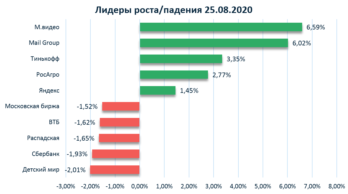 Сегодня отличились акции Mail Group, которые выросли более чем 7% без каких-либо новостей – основная причина гонка с Тинькофф за включение в индекс MSCI Russia, что в свою очередь приведёт к притоку иностранного капитала. Чтобы понять, на сколько сильный будет эффект, посмотрите на динамику акций Яндекса. Тем временем, котировки М.Видео после сильной финансовой отчётности за II кв. 2020 г. по МСФО и в ожидании новой дивидендной политики движутся с ускорением в сторону исторических максимумов. При этом, акции компании уже с конца мая выросли на 70%. Детский мир опубликовал финансовые результаты за II кв. 2020 г. по МСФО. Несмотря на пандемию, ритейлеру удалось показать сильные финансовые результаты за счёт онлайн сегмента, выручка которого увеличилась в 3,2 раза, а доля онлайн – продаж в общей выручке достигла 31,2%. Ждём сохранения положительной динамики и увеличения дивидендов. Подробнее смотрите в нашем обзоре. После публикации сильной финансовой отчётности, менеджмент компании с