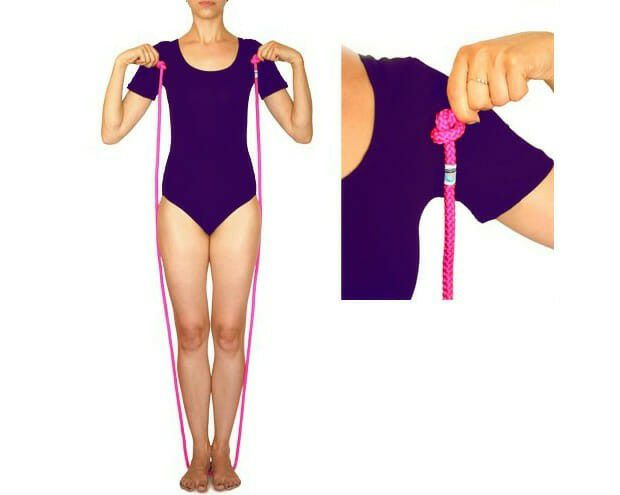 Как правило, покупаемая скакалка оказывается велика, поэтому ее необходимо обрезать под рост гимнастки. Считается, что обрезать скакалку нужно с обеих сторон, чтобы не изменялась центровка, и завязывать одинаковые узлы с обоих концов. Сколько сантиметров обрезать лучше подскажет тренер. Скакалка подходит под рост гимнастки, если стоя двумя ногами на ее середине узлы доходят до подмышек. Маленьким деткам можно оставить «на вырост» — чтобы узелки доставали до мочек ушей.