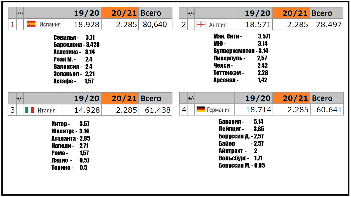 Испанская "Севилья" принесла в копилку своей страны больше всех - 3,71. Лучшим английским клубом прошедшего сезона стал "Манчестер Сити" (3,571). Итальянский "Интер" пополнил рейтинг Италии на 3,57 очка, а "Бавария" принесла гигантскую сумму - 5,14