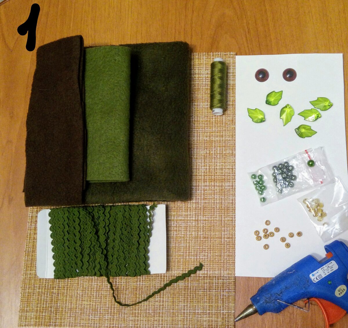 1. Для работы нам понадобятся: ткань флис темно-зеленая, коричневая и травянисто-зеленая, тонкий картон, мешковина (я использовала салфетку под горячее), тесьма волнистая, глаза пласиковые, бусины пластиковые и деревянные мелкие, крупный стеклярус в виде листьев, нитки зеленые, синтепон, клеевой пистолет, рамка дерево 20х30см.