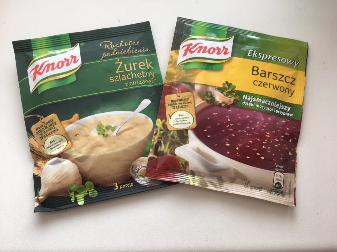 Для обзора я выбрал два, по моему мнению, очень интересных продукта. Первый - суп журек с хреном и чесноком, это традиционный польский суп на мучной закваске. Цена 5.64 польских злотых или 112 рублей по нынешнему курсу, что, на мой взгляд, достаточно дорого для супа из пакета