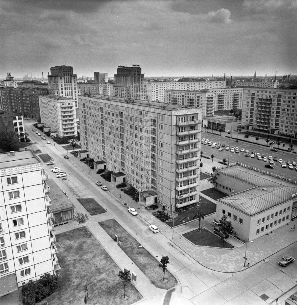 Начало главы здесь. Вот мы выехали на Карл-Маркс-Аллею, и направляемся прямо на Александерплатц. После брутальных, а-ля сталинских зданий, нас сразу окружили современные блочные дома. Слева проезжаем кафе «Москва». Напротив него на другой стороне кинотеатр "International". По своему назначению он соответствовал кинотеатру «Россия» в Москве. Там проводились важные кинопремьеры. А за ним виден отель "Berolina". На этой части улицы проводились важные государственные мероприятия. Едем дальше – уже на горизонте слева виден небоскреб отеля "Stadt Berlin", который был построен в период 1967 по 1970 год. Всегда помню это здание, это "Дом учителя". А рядом с ним уже сам Alexanderplatz. Жизнь тут кипит. Вот здесь хорошо видно здание старого "Centrum". Это универмаг, который был сродни нашему ГУМу. Его почти близнец, с таким же названием был еще в одном месте – рядом с Восточным вокзалом (Ostbahnhof). Вообще, под торговой маркой CENTRUM было построено много магазинов не только в Берлине, но и