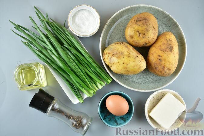Большой дранник с начинкой из плавленого сыра и зелени Сытное блюдо из картофеля - большой драник с начинкой из плавленого сыра и зелёного лука. Такая лепёшка, напоминающая драник, готовится на сковороде вполне быстро и совсем несложно - неплохой питательный завтрак или перекус! Подготовим продукты по списку.