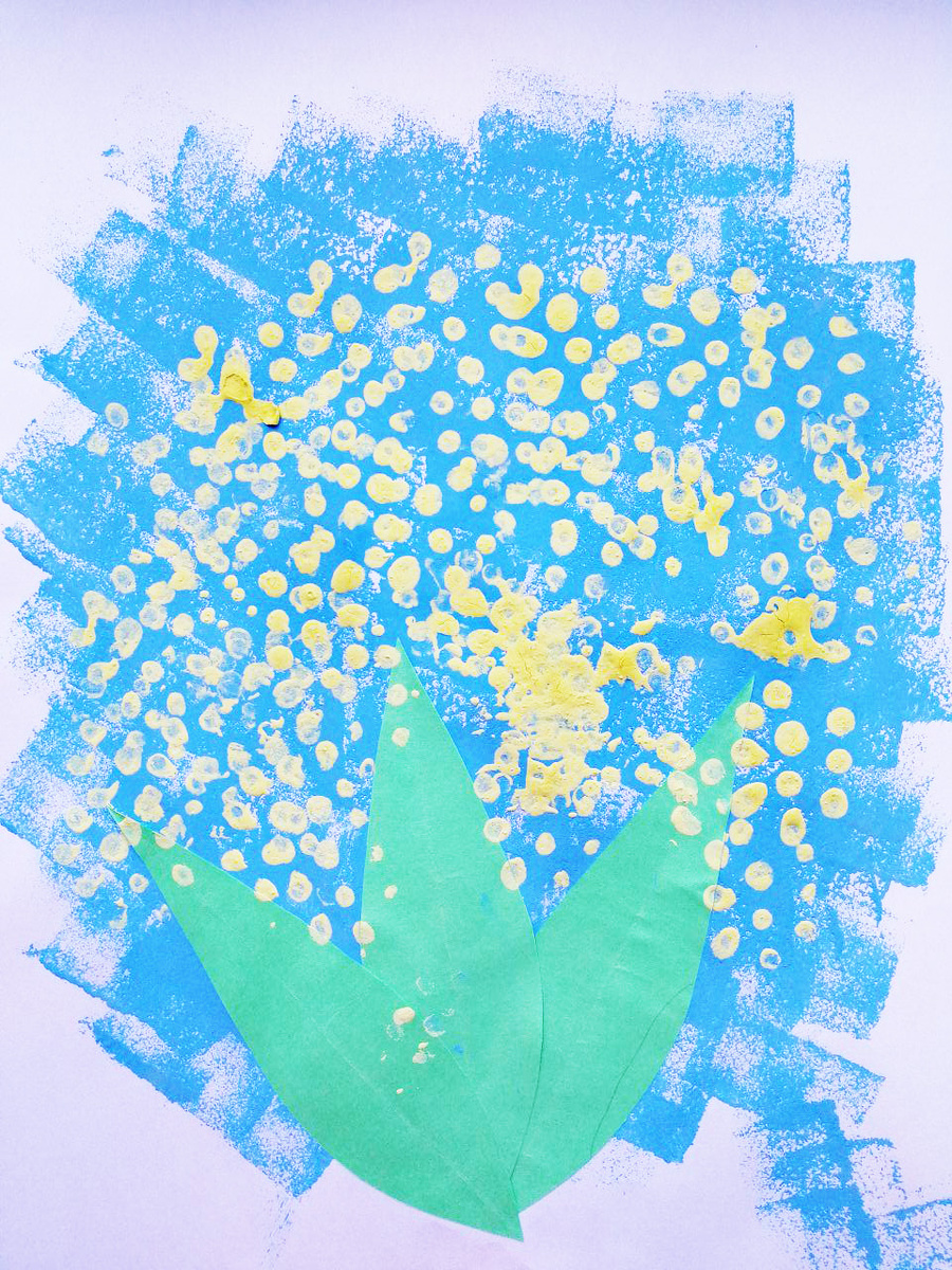 Самоизоляция! Дети-дома! Чем занять? (фотоподборка) Простой способ (подходит от 9 мес. до 99 лет) Поделка Цветочек Нам нужно: Приступим: Берем губку и синюю краску и даем ребенку в руки. Мазючим в краску и начинаем прихлапывать губкой по белому листу, тем самым создавать фон. Даем высохнуть. Далее берем ватные палочки, как букете и макаем в желтую краску. Тычем по синему фону и делаем подобие букета. И снова даем высохнуть. Вырезаем из зеленой бумаги листья и приклеиваем снизу. И вуа ля, наш Цветочек готов. Пусть ребенок сам придумает название шедевру.