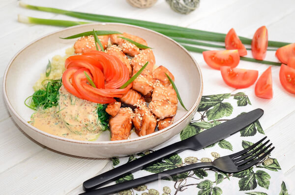 томаты, кускус, соус терияки, соус ореховый, масло кунжутное, лук зелёный, кунжут белый, филе форели, салат чука