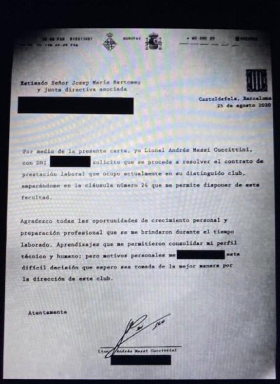Издание TyC Sports опубликовало фотографию факса капитана «Барселоны» Лионеля Месси, в котором аргентинец подал запрос о расторжении контракта. Я, Лионель Андрес Месси Куччиттини, подаю запрос о расторжении действующего контракта с вашим уважаемым клубом на основании пункта 24, дающего мне такое право. Я благодарен за все те возможности для профессионального и личного роста, которые были предоставлены мне за время работы, а также уроки, которые позволили мне укрепить мои личностные и технические характеристики. Однако по личным причинам я принял это тяжёлое решение, которое, я надеюсь, будет наилучшим образом принято руководством клуба. Тут ещё написано про Лионеля Месси https://zen.yandex.ru/media/id/5f3d9ace24b29420ab5d7b1a/messi-gneven-na-administraciiu-barselony-5f42af99ec8ffe34a049ef57