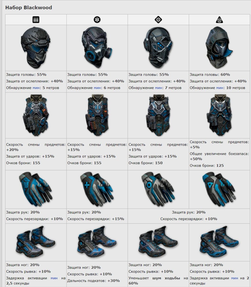 БОНУСЫ ЗА КОМПЛЕКТЫ: * 2 предмета из комплекта штурмовика. Дополнительно уменьшает отдачу на 10% * 2 предмета из комплекта медика. Дополнительно увеличивает скорость рывка до 15% * 2 предмета из комплектов инженера и снайпера. Дополнительно увеличивает точность на 15% * 3 предмета из комплектов. Дополнительно восстанавливает по 4 очка здоровья и брони (через 3 сек. без получения урона (не суммируется с другим снаряжением) * 4 предмета из комплекта штурмовика. Дополнительно снижает входящий урон на 15 единиц за попадание. Дополнительно увеличивает защиту от взрывов на 40% * 4 предмета из комплектов медика, инженера и снайпера. Дополнительно снижает входящий урон на 15 единиц за попадание. Дополнительно увеличивает защиту от взрывов на 30% В набор Blackwood входит по 4 уникальных предмета для классов «Штурмовик», «Медик», «Инженер», «Снайпер». Каждый из них имеет свои характеристики, а бонусы набора нацелены на увеличение точности, восстановление брони и здоровья, защиту от взрывов и у