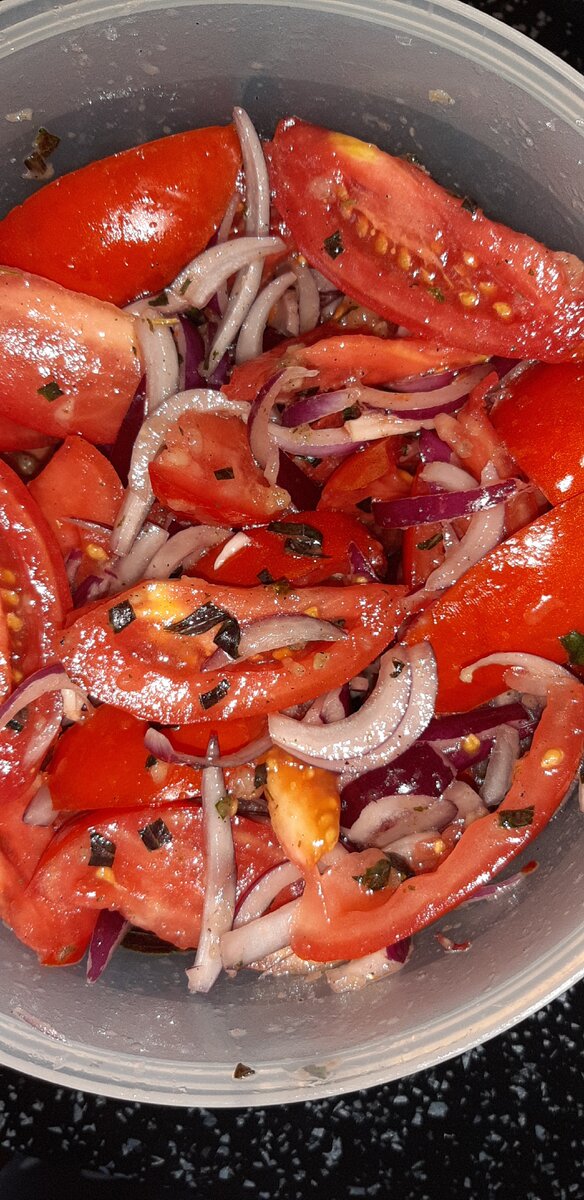 Хочу поделиться рецептиком очень простого и быстрого в приготовлении.Этот салатик отличная закуска ко всем блюдам. Помидоры,лук(не обязательно красный)чеснок пару зубчиков,базилик(можно и сушёный) У меня сорт сливка,но можно любые Готовим заправку 2ст.ложки масла подсолнечного,чеснок через пресс,черный перец,соль 1ч.ложку,базилик.Всё хорошенько перемешиваем. Теперь выкладываем в глубокую чашку слоями помидоры,лук,затем опять помидоры лук Как все слои уложили,поливаем нашей заправкой. Теперь накрываем крышкой и в холодильник,через пол часа всё перемешиваем аккуратненько,и можно подавать к столу Попробуйте обязательно этот простой,но очень вкусный рецептик.Съедается на ура)