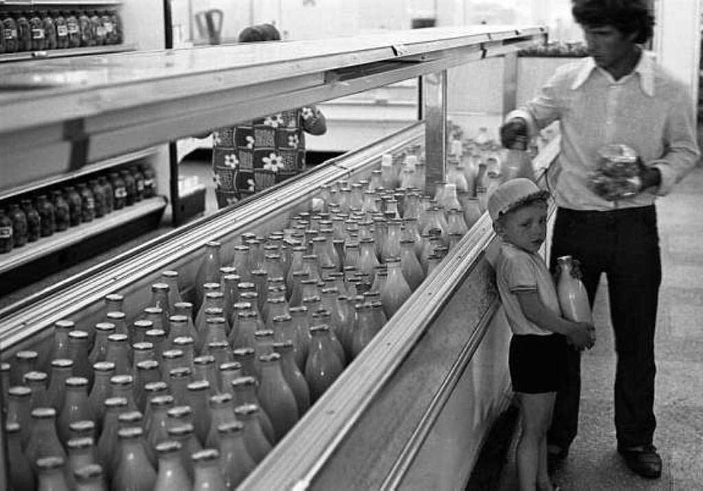 На фото — типичный молочный холодильник в советском магазине 1970-80 годов, засталвенный типовыми молочными бутылками. Еще были типовые пивные бутылки (0,5) и бутылки из-под водки и вина (0,5 и 0,7), а также типовые банки — из-под майонеза, из-под сметаны и консервов и большие трехлитровые. Всю эту посуду принимали в пунктах приёма стеклотары — больше всего туда несли пивные и молочные бутылки и майонезные мелкие баночки. Банки покрупнее использовали в хозяйстве, а трехлитровые "баллоны" вообще никто и никогда не сдавал — их использовали для домашнего консервирования, "закаток".