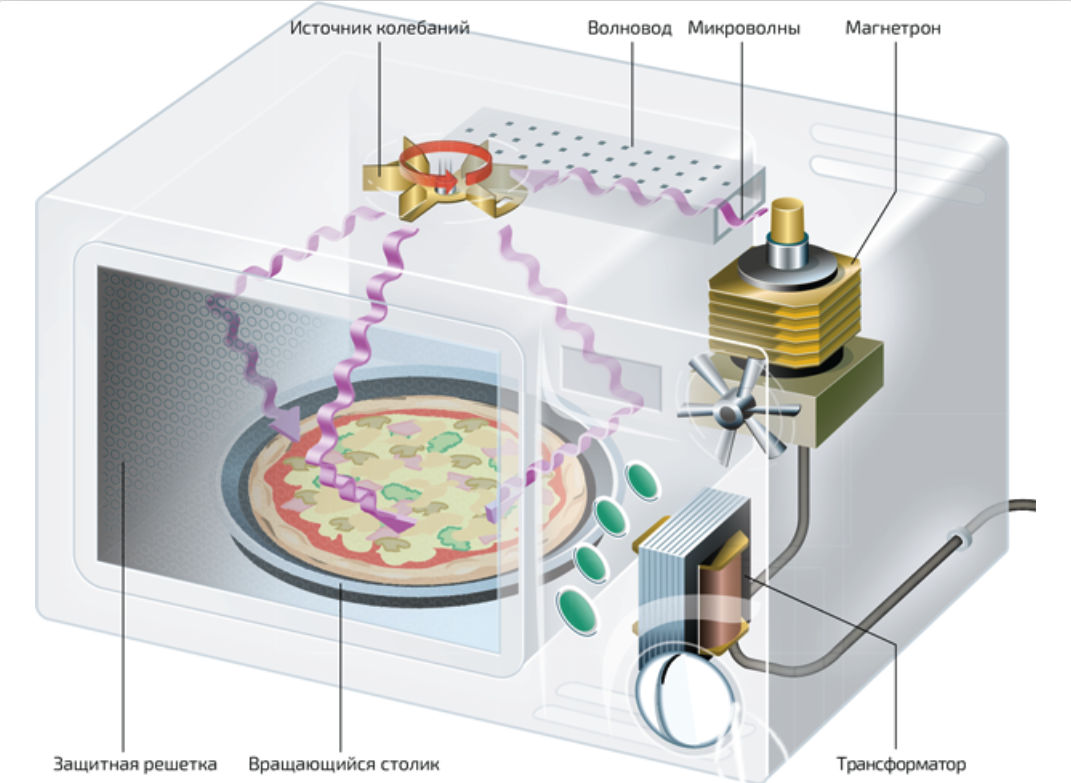 В электромагнитной волне электрическое поле постоянно колеблется, а вслед за ним колеблются и молекулы воды. Затем это движение уже передается и всем остальным атомам пищи. А увеличение интенсивности движения атомов — это повышение температуры тела!